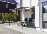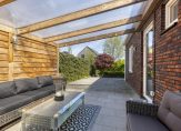 Aan de achterzijde van het huis is een ruime overkapping waardoor een gezellige intieme en privacy rijke plek is ontstaan.
