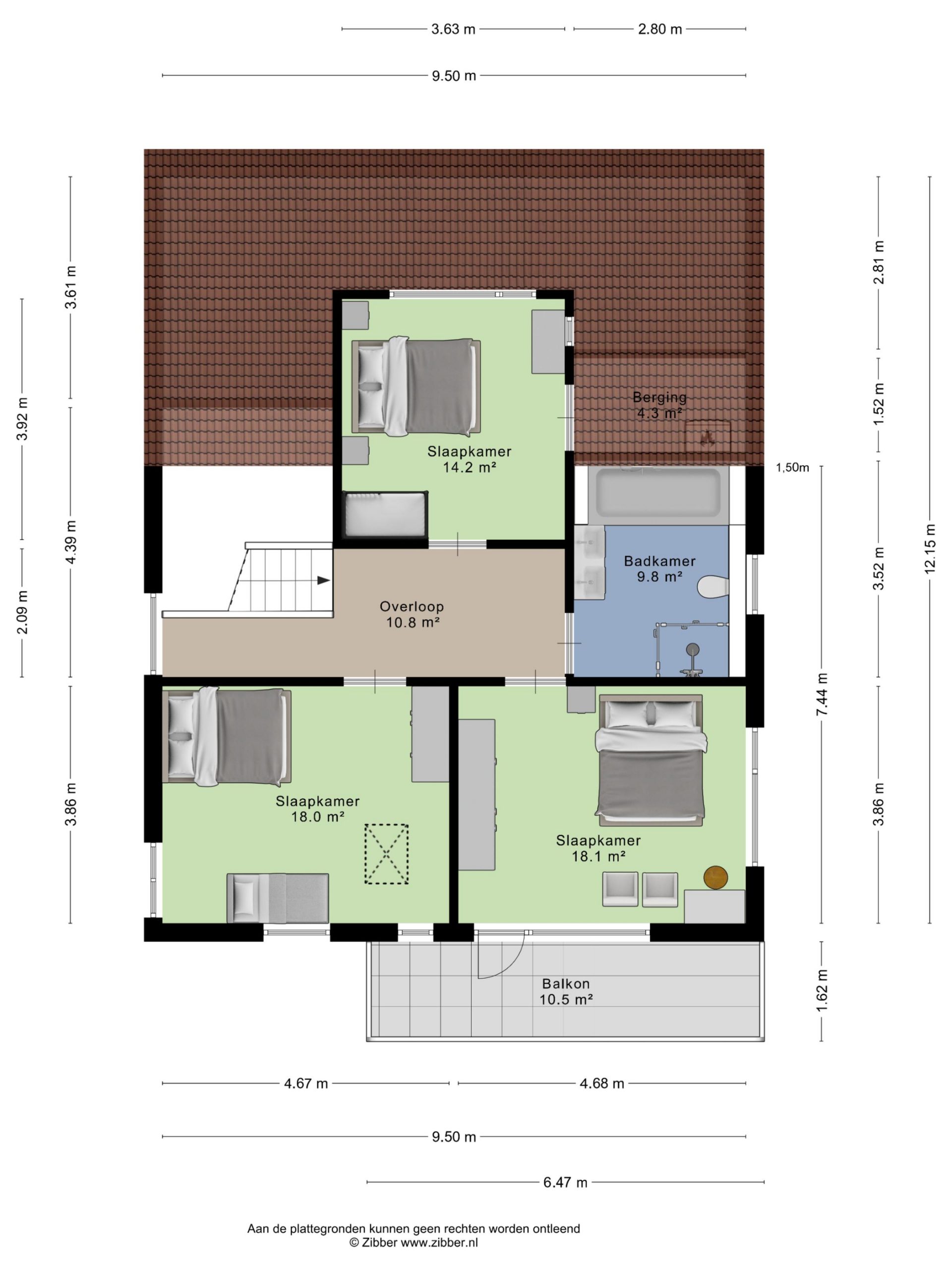 Via de fraai vormgegeven makkelijk lopende trap bereik je de verdieping met 3 slaapkamers van ca. 18, 18 en 14 m² met aan de voorkant een balkon van 11 m², Luxe moderne badkamer van ca. 10 m² met een 3de toilet, wastafelmeubel, whirlpool extra breed en douche, vanuit een slaapkamer is de vliering bereikbaar.