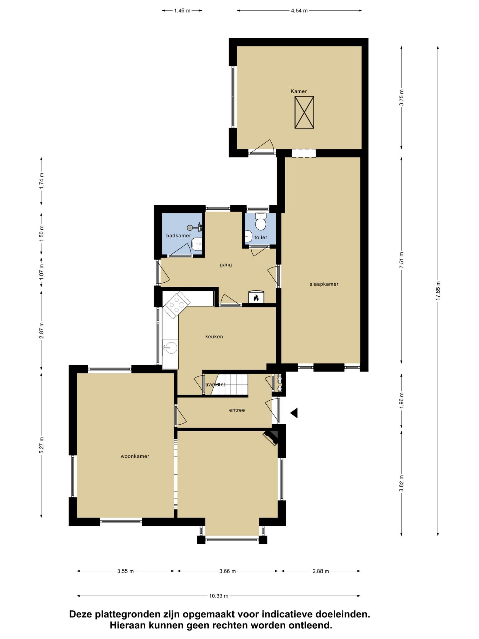 Hal, lichte L-vormige woonkamer van ca. 33 m² met parketvloer, erker en sierhaard, gezellige keuken van ca. 11 m²). De keuken is uitgevoerd in een hoekopstelling met een afzuigkap en een gasfornuis, kelder. Hal/entree aan de Jonkerslaan met toegang tot het toilet met een wasbakje, de badkamer met een douche, handdoekenradiator en wastafel ca. 2,2 m². Slaapkamer van ca. 22 m² met een doorgang naar de studeerkamer van ca. 17 m² met vliering.