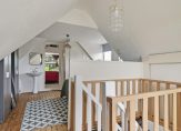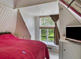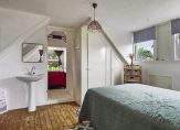 Overloop, 2 slaapkamers waarvan 1 met wastafel, loggia/zonneterras aan achterzijde met uitzicht over een schapenwei.